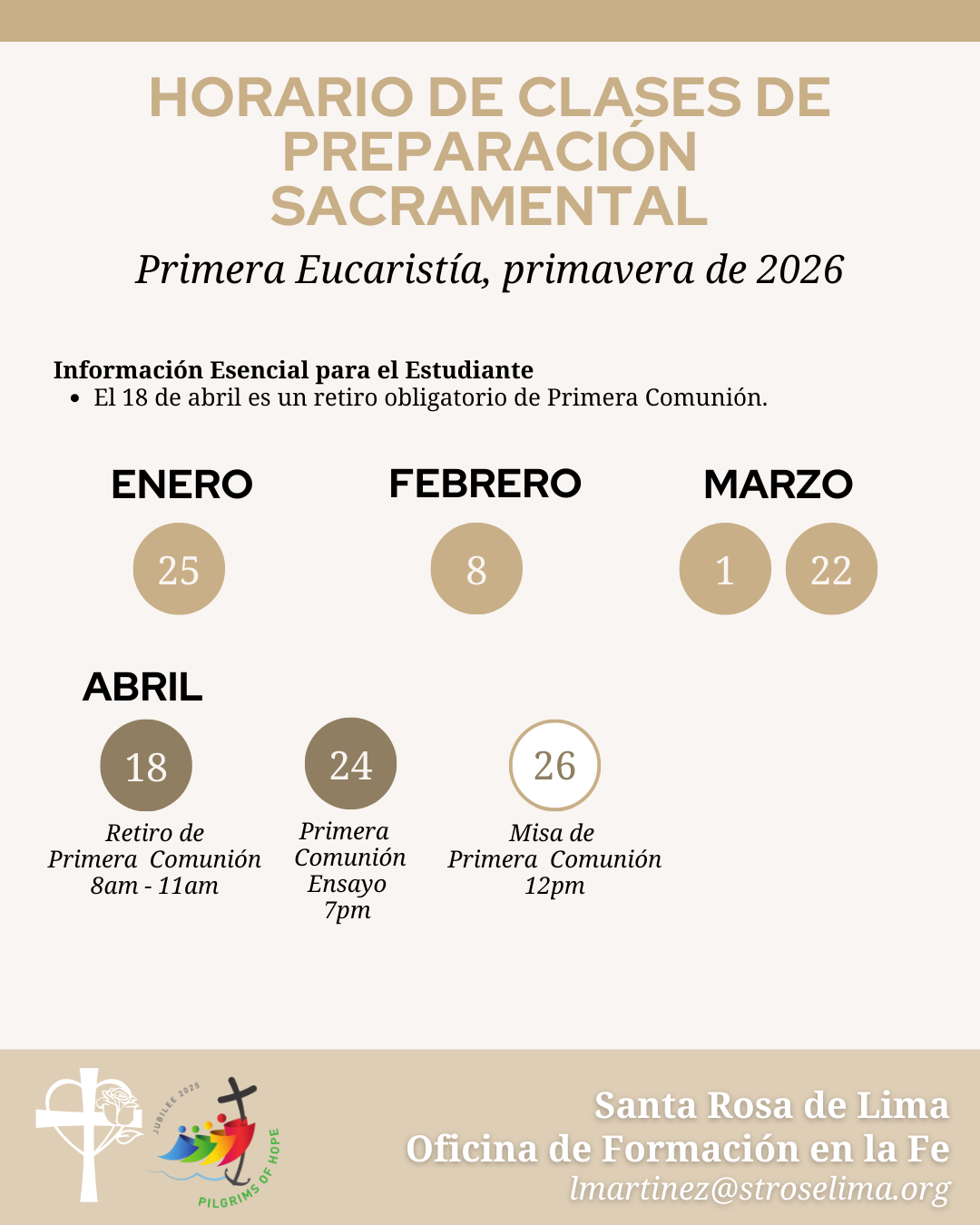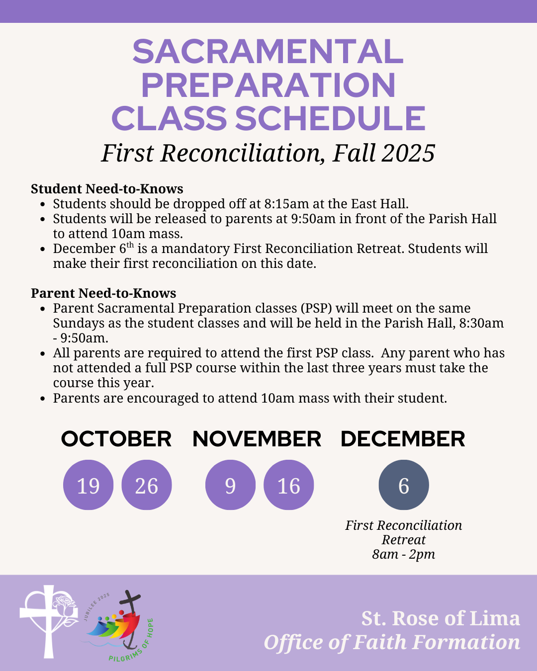 At St. Rose of Lima, our mission is to inspire a lifelong journey of faith for all members of our community—children, youth, and adults. Through our Faith Formation programs, we seek to deepen our understanding of God’s love and teachings at every stage of life. Whether you're nurturing the faith of a child, guiding youth through their spiritual development, or enriching your own adult faith journey, our goal is to provide the education, support, and community needed to grow in Christ’s love and service.