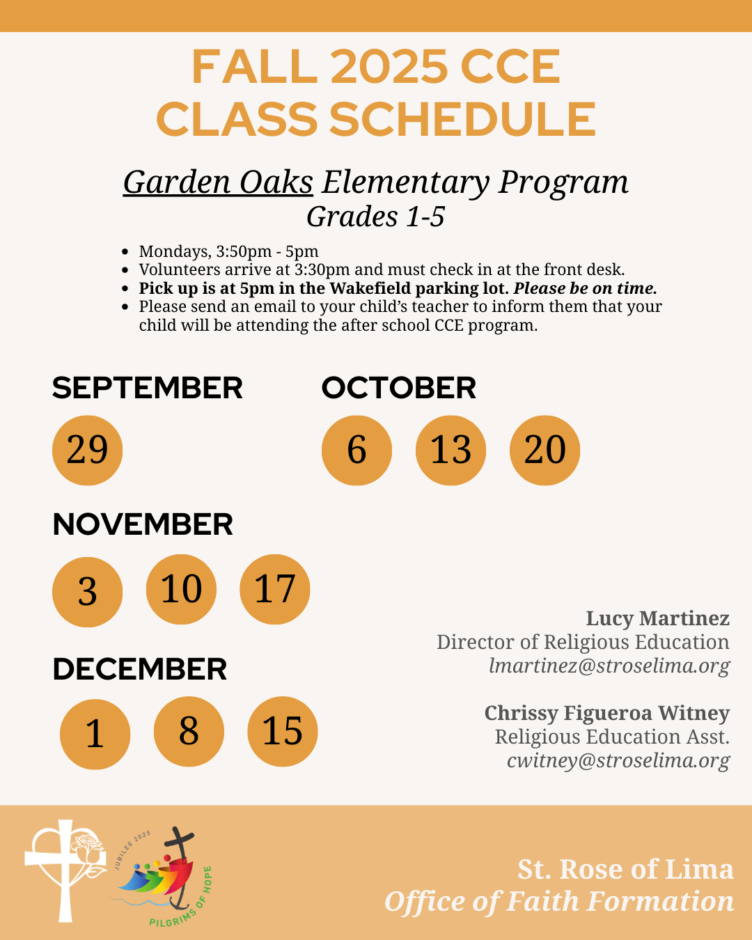 For the 2024-2025 school year, ELEMENTARY CCE CLASSES WILL BE HELD: