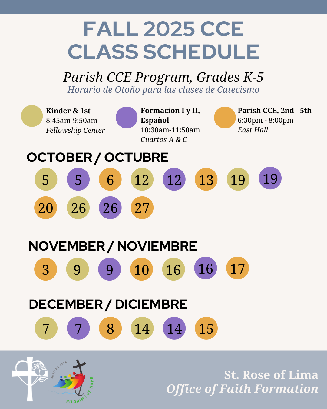 Faith Formation begins on Sunday, September 15 from 9:45am - 11:00am for Pre-K, Kinder, and First Grade Students. Second Grade - Fifth Grade students meet on Monday nights from 6:30pm - 8:00pm starting on September 16.